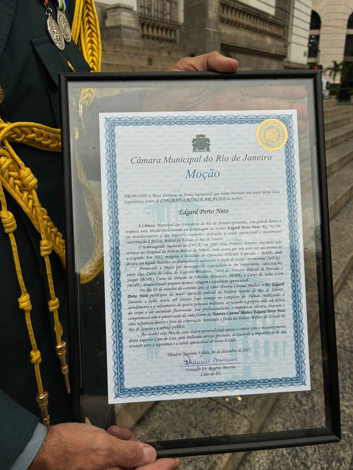 A homenagem, proposta pelo vereador Dr. Rogério Amorim, destacou a trajetória exemplar do oficial, marcada por dedicação, coragem e excelência no exercício da medicina operacional no âmbito da Polícia Militar do Estado do Rio de Janeiro.